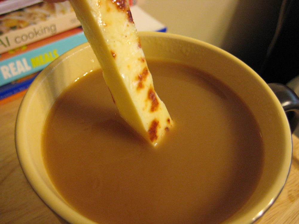The brown spots are supposed to be there, and there were no other visible deformities, so that’s a good sign. I sliced a good sized finger of cheese, then poked it right into some nice hot, strong coffee.