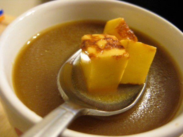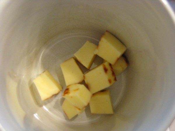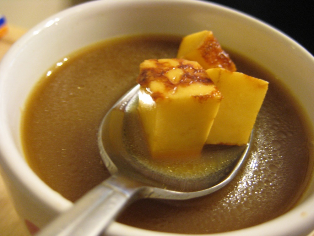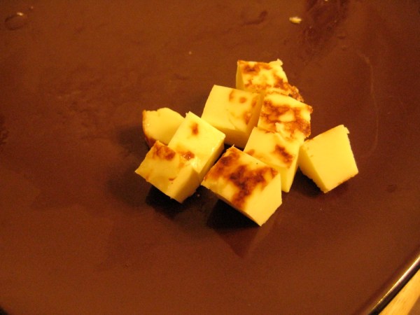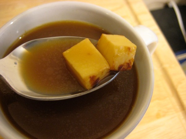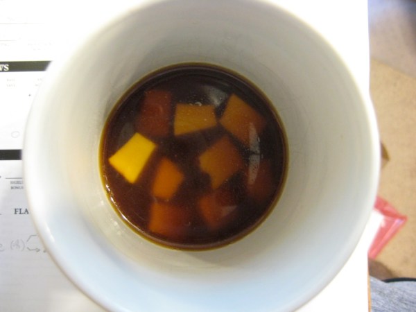 Even after extended exposure to steaming hot coffee, this cheese didn’t melt. It’s a tough little mofo. Each cube had that mellowed-out taste I described last time, except more so. The bigger surface area and the ability to mix coffee and cheese in each spoonful really allowed the flavours to mix.