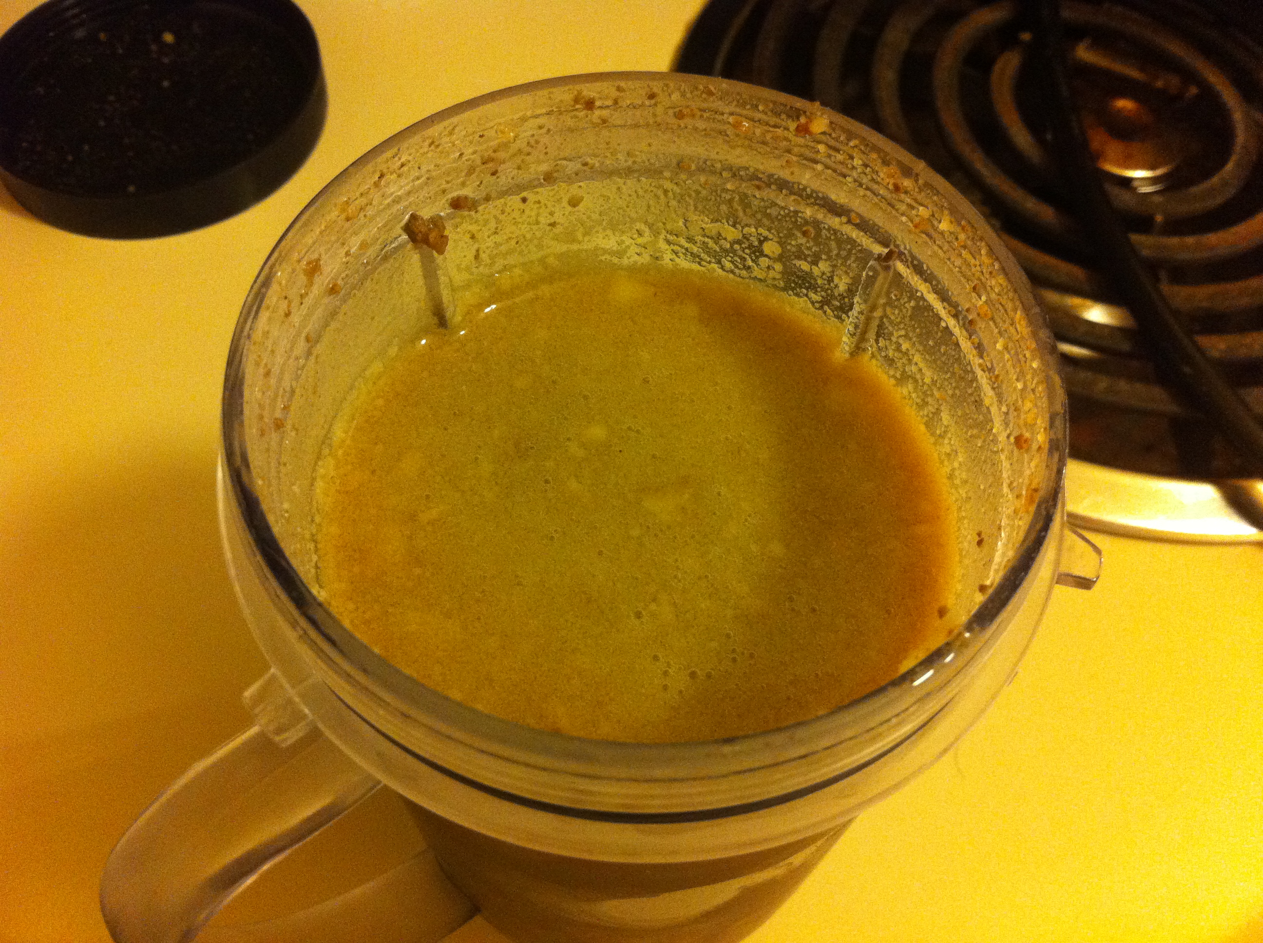 I ran into a problem. The meat had made the coffee oily and thick; so much so that it refused to drip through my coffee filter. I had to carefully squeeze the filter, coaxing it out the bottom a squirt at a time, not unlike milking a cow. I did this twice, to make sure no chunks remained. It was a slow process, and yielded only a tiny amount of thickened coffee.