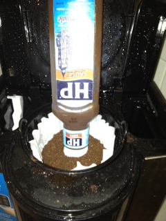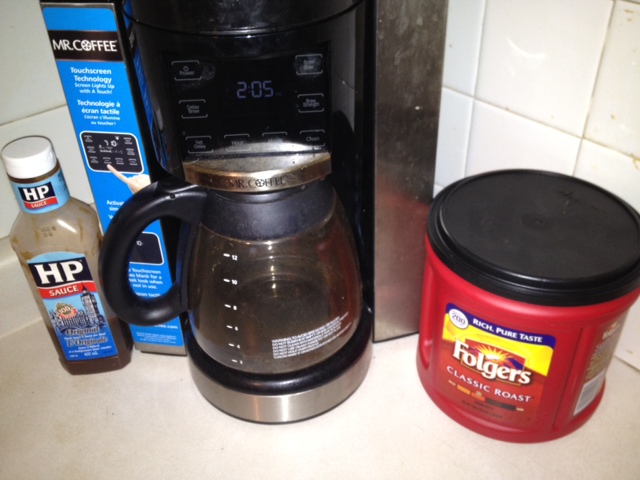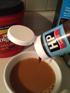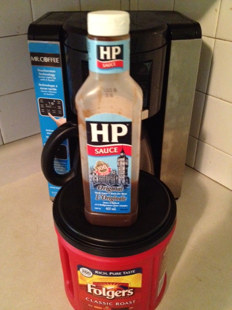 And the result was fabulous! It turns out the film’s writer was not punking his audience, and that HP Sauce in coffee is, indeed, quite delicious. I shall henceforth enjoy my coffee in this manner as often as I remember to do so. I’ve set up a reminder on my iTracker so that every morn, just as the coffee has finished brewing, it prompts me to insert the sauce.