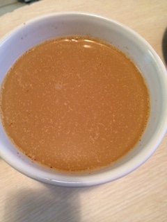 Then I made the coffee, poured it in a cup that I keep mainly for that purpose, though I occasionally use it for orange juice when all the glasses are dirty and I couldn’t be bothered washing one, and put the sauce in the coffee-filled cup; exactly half as much as you’d use for a medium-sized serving of McDonald’s fries.