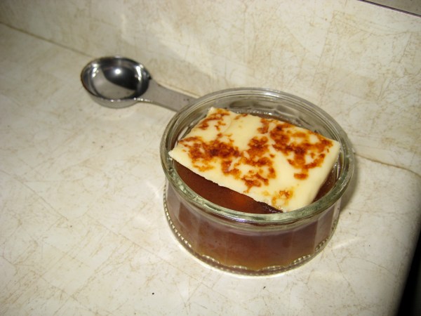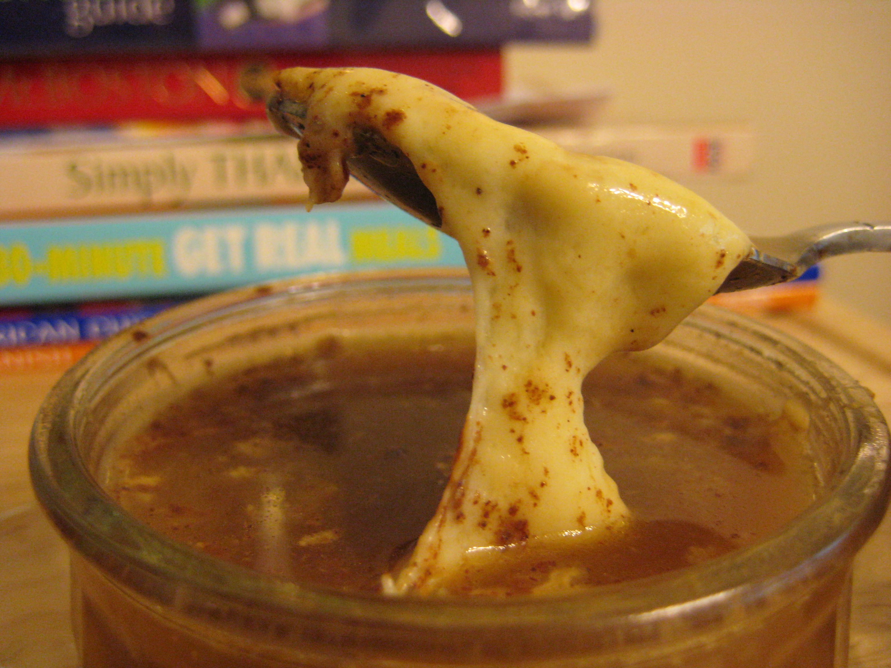 This reminded me a lot of French Onion soup, in texture and even in taste; it’s a bit less salty, more sweet, but it’s got that delightful soggy melted cheese flavour that the French refer to as merde fondu dans ma bouche.1